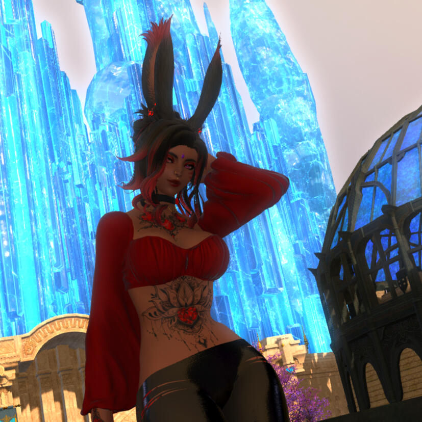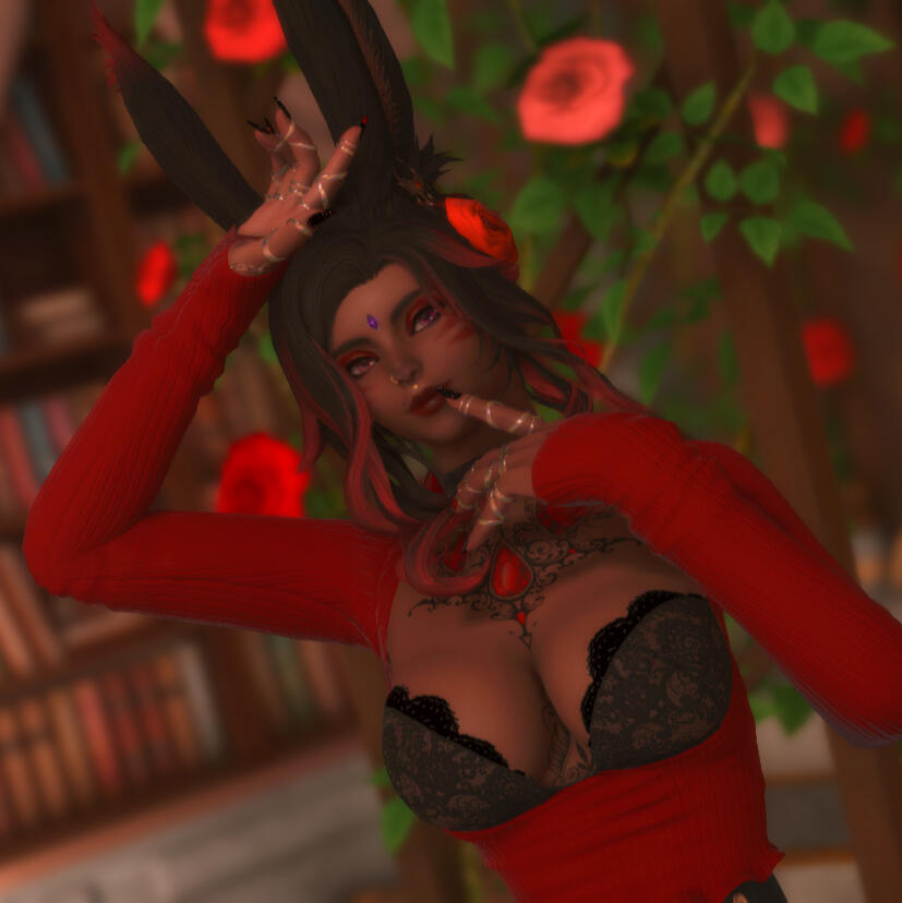 -Tattoos: two streaks on each cheek. Jeweled heart on stomach, back and arms. 3 gems on clavicle. Rose trellis on side of legs from knees to hips. Jobs in order of preference: Red Mage, Dancer, Reaper, Black Mage, Summoner, Bard, Ninja, Dark Knight, Weaver, AstrologianOther: -Likes burning things.