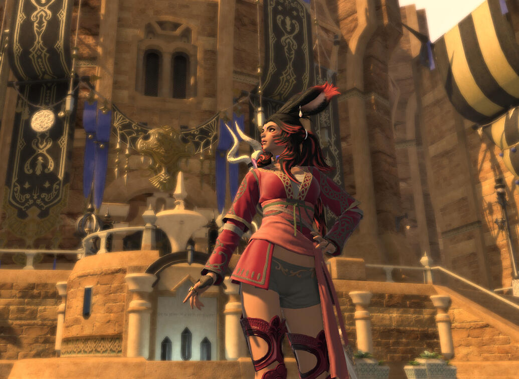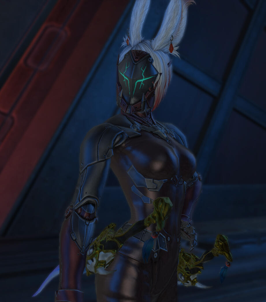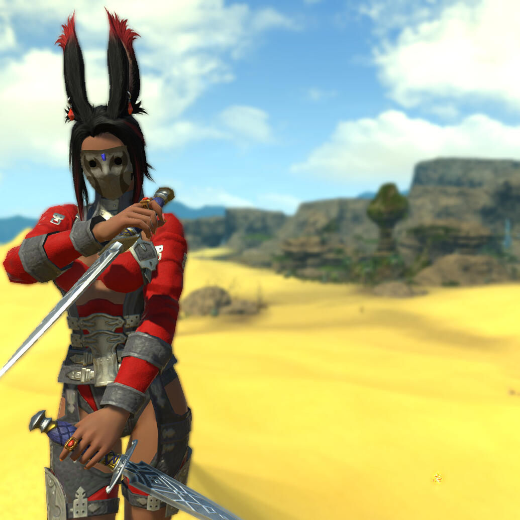 She was found by the Children of the Sands and brought back to the Forgotten Springs when she showed signs of life. At the request of the Flames stationed there and given the technical nature of her mask and assuming her Garlean agent, the Nunh allowed her to stay so that they may take her to Ul'dah for questioning once she recovered.Sometime later she woke to the sounds of battle as Sandworms stormed the gates of the Springs. On instinct, she armed herself and lay waste to the creatures alongside the huntresses with ease before falling unconscious once more from over-exerting herself. The Nunh was impressed with her skill and would allow her sanctuary if she can prove herself further as she is an outsider after she reawakens and reveals she can't remember anything prior, even when he showed her the mask. Thus keeping her out of the Flames custody but still on observation.Looked on with contempt and treated as such at first, she eventually earns her place amongst the huntresses (also receiving a new more tolerable mask), becoming an instructor. She wants to see these women, fledgling and seasoned alike, thrive and protect themselves for who else would be there when alone in the desert? Outside of custom and despite her being Viera and an outsider, she was given the name U'anh, her forest name and early life being the only things she remembers.She was somewhat happy with her newfound family and life while still harboring resentment for her home, especially given the traditions of the U that your moment of weakness is your own, only the strong survive. Hence her need to uplift her fellow huntresses and friends and others in general in the future.An incident had her violently lose herself. Some huntresses were captured in a three-way skirmish with Amalj'aa and the Corpse Brigade. While the Nunh insisted they can free themselves, sensing U'anh's fiery passion to fight for them and her throwing back at him that she's still an outsider so he can't stop her.She goes to rescue her fellow huntresses, even offering herself to the brigade in exchange for their freedom, for once going against her morale and saying she would be more worth their time than these scraggly kittens.It is all a ruse of course, once the huntresses safe, she let loose. Driven by her need to protect and to make these monsters pay for preying on those who cannot defend themselves, she massacred them in a flurry of blades and flames. She left one alive to send a message to the rest of their brigade that if they so much as blink at Miqo'te ears and tail, remember what occurred.She returned to the springs, bloodied and ashened though the blood was not hers.After another bout of unconsciousness, she expressed her concerns to the Nunh. How she enjoyed the killing of those brigands more so than the hunt of creatures but she doesn't want to accidentally hurt her friends if they're around her should that come to pass once more, that she needs a better handle on her abilities. He suggests she journey to the Arrzaneth Ossuary in Ul'dah to temper her flames.The sooner she can control her power, the safer she and everyone will be. With a final gift of a dyed robe in her favorite color for her journey, she set forth to Ul'dah.**☛ **New Hunt